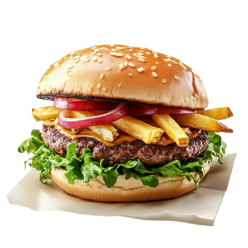 نان گرد، سس مخصوص، دو عدد برگر ۱۵۰ گرمی، کاهو، گوجه، خیارشور