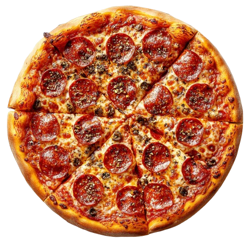 خمیر ایتالیایی، سس مارینا، پنیر موتزارلا، فلفل دلمه، پپرونی، قارچ، زیتون سیاه